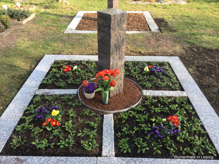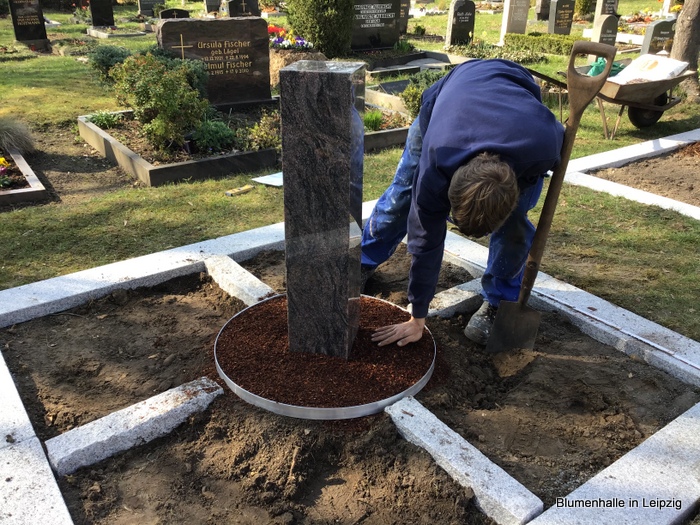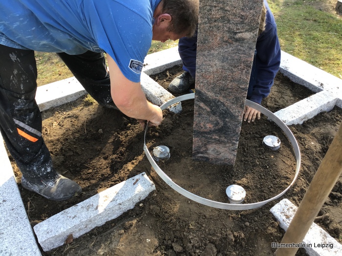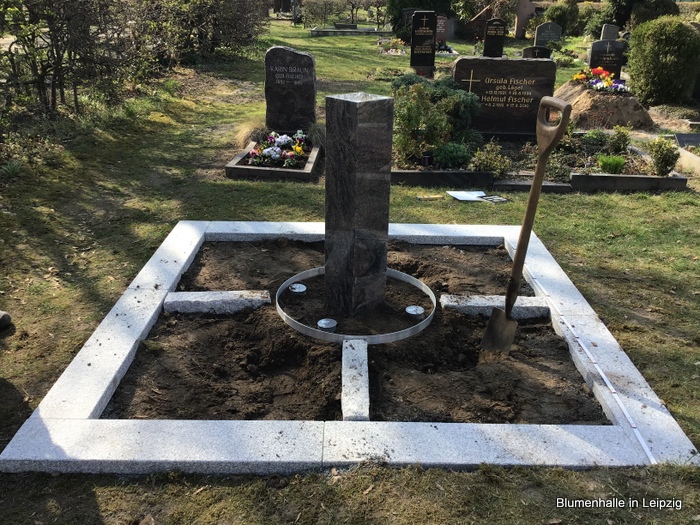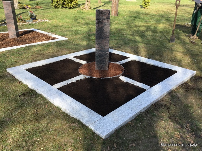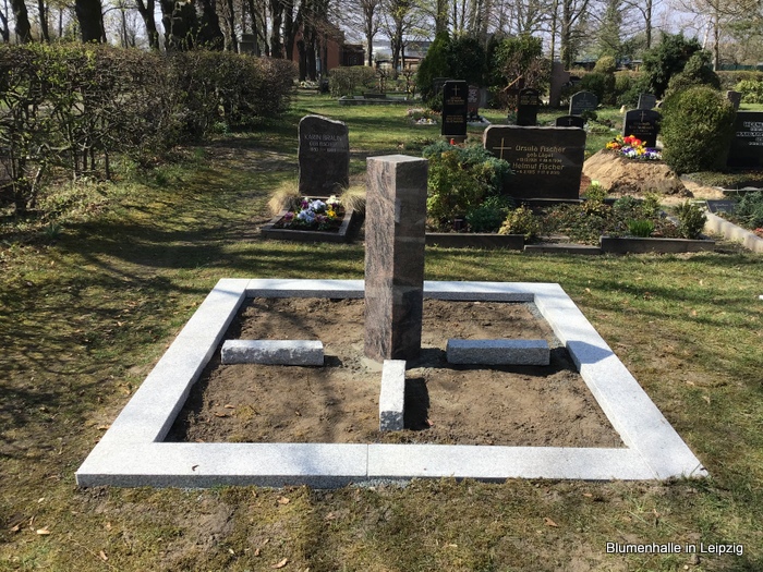 Eine schöne Stele in der Mitte, dazu eine flache Umrandung aus Stein mit einer Grababgrenzung als Trittmöglichkeit