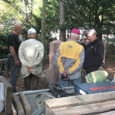 - Die Steine werden nun auf der Grabstätte verteilt. Die Geologen Prof. Jacobi und Dr. Köhler sowie Mithelfende sind hierbei beschäftigt.