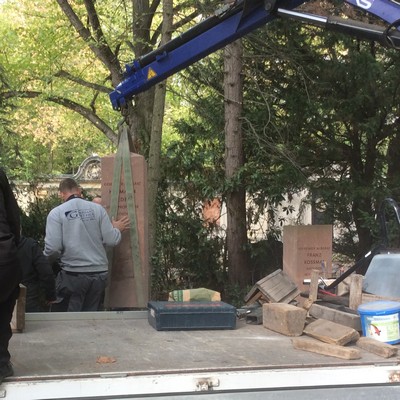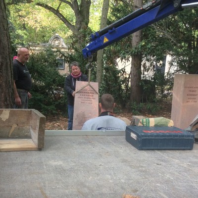 - … mit längs befestigten Gurten kann der Grabstein schließlich platziert werden.