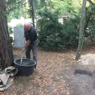 - Herr Paul höchstpersönlich rührt den Beton für den Grabstein an.