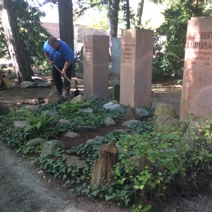 Weiterhin wurde den Menschen Dank ausgesprochen, die durch Ihr körperliches Zutun diese Grabstätte geschaffen haben. Insbesondere Steinmetzmeister Herrn Günther, der übrigens den Grabstein für Robert Lauterbach neu gestaltet hat sowie Friedhofsgärtnermeister Herrn Schröder, welcher sich an die Herausforderung einer Neugestaltung des Grabes wagte und eigene Vorstellungen und konkrete Vorschläge äußerte.
